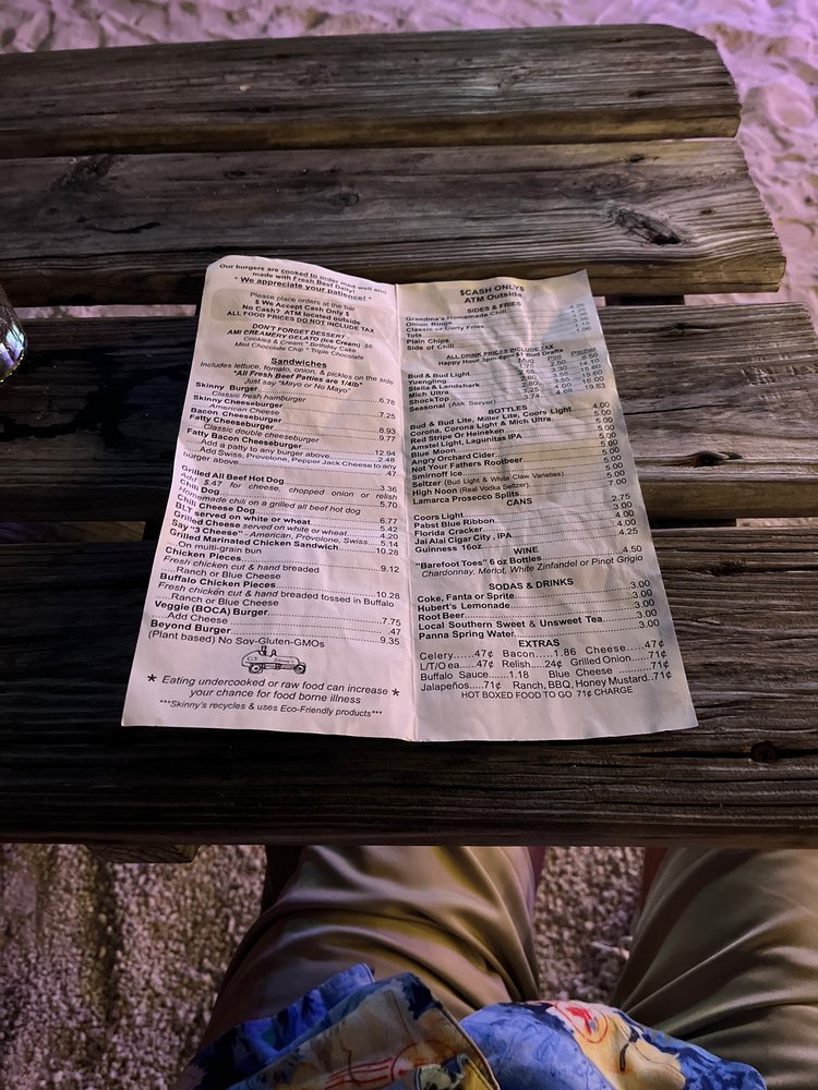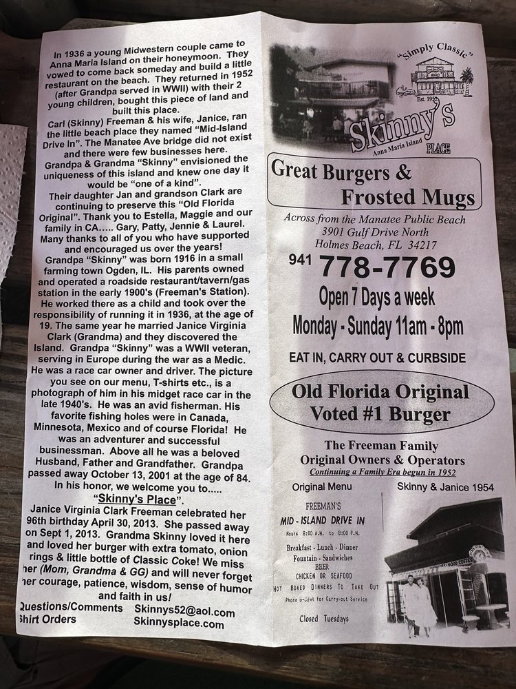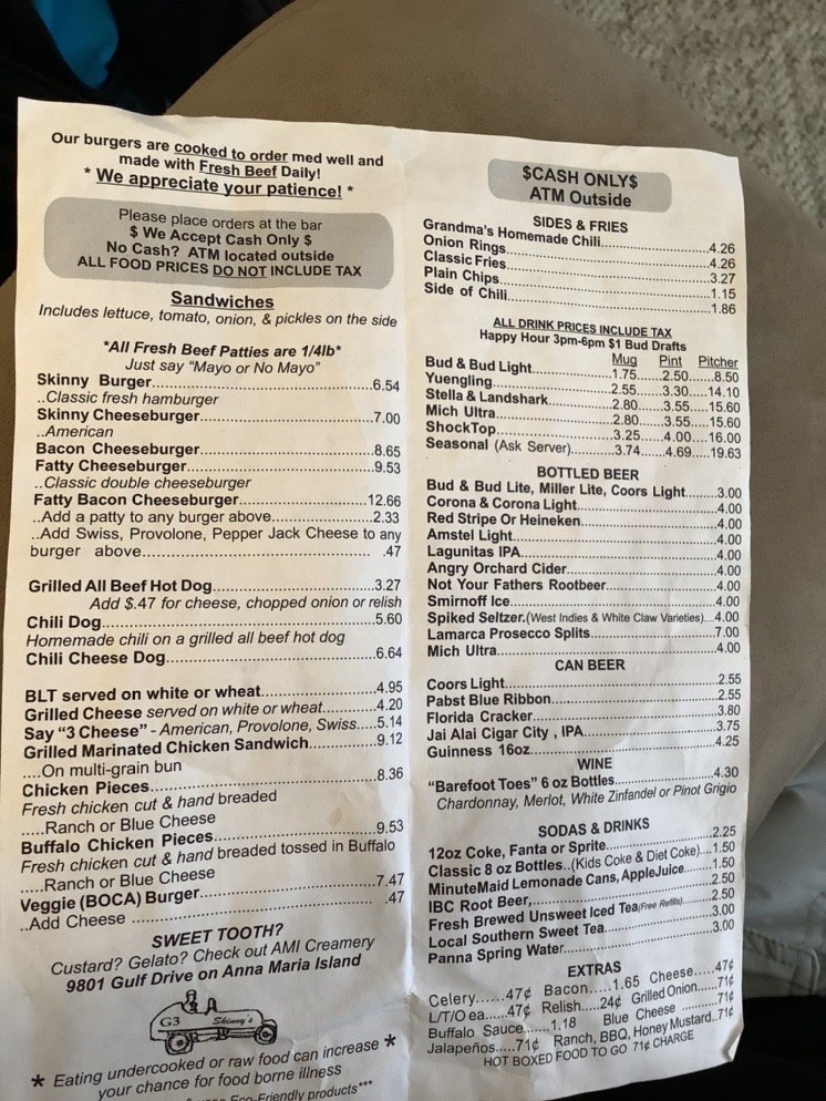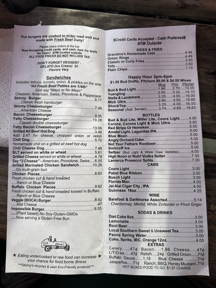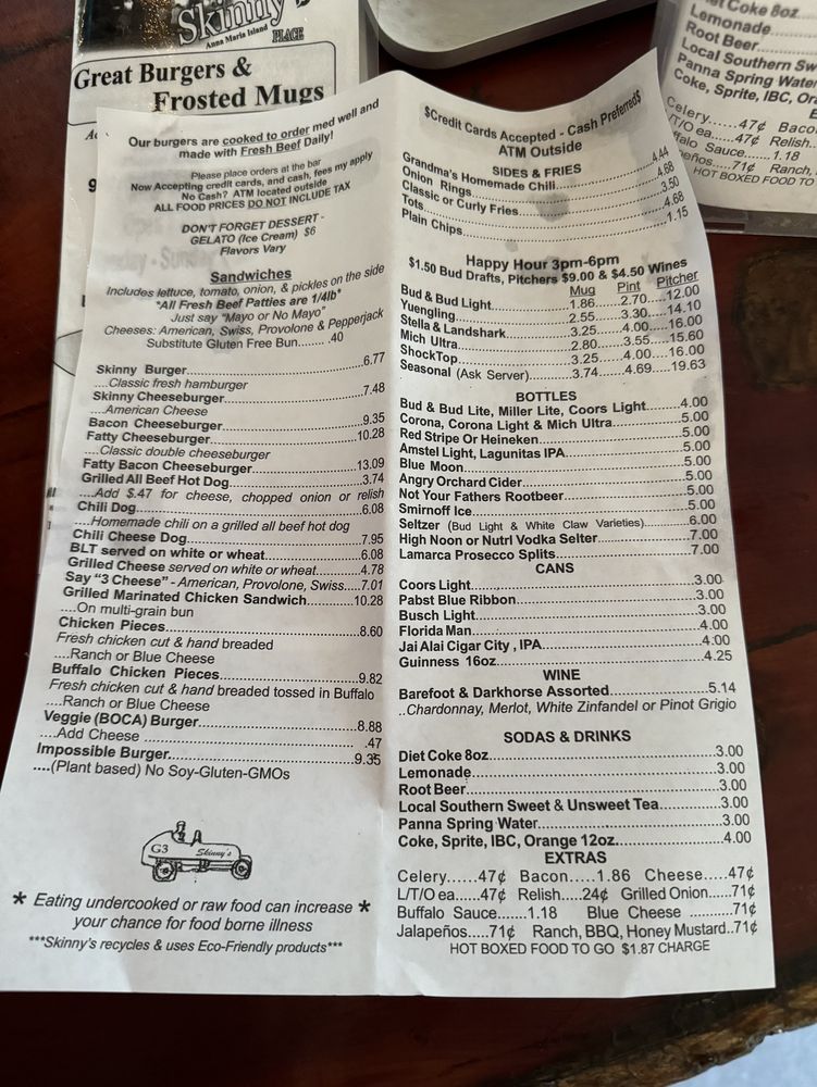 Skinny's Place, located in Holmes Beach, FL, is a casual eatery known for its hot dogs, burgers, and sandwiches. With a diverse menu offering options like the Mid Island Pounder, the G3 triple burger, and the Veggie Burger, there is something for everyone. Sides like Grandma's Homemade Chili and Fatty Fries complement the main dishes perfectly. Customers rave about the laid-back atmosphere, friendly service, and delicious food. The outdoor seating and beach shack vibe add to the charm of this hidden gem. Whether you're looking for a quick beach lunch or a casual dinner spot, Skinny's Place delivers great flavors at affordable prices. Overall, Skinny's Place is a must-visit for those seeking a relaxed dining experience with fantastic food and excellent service.