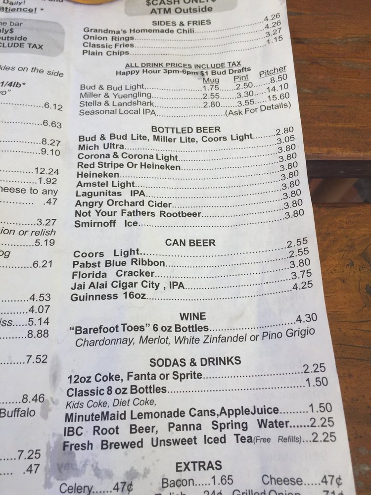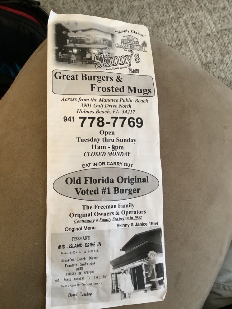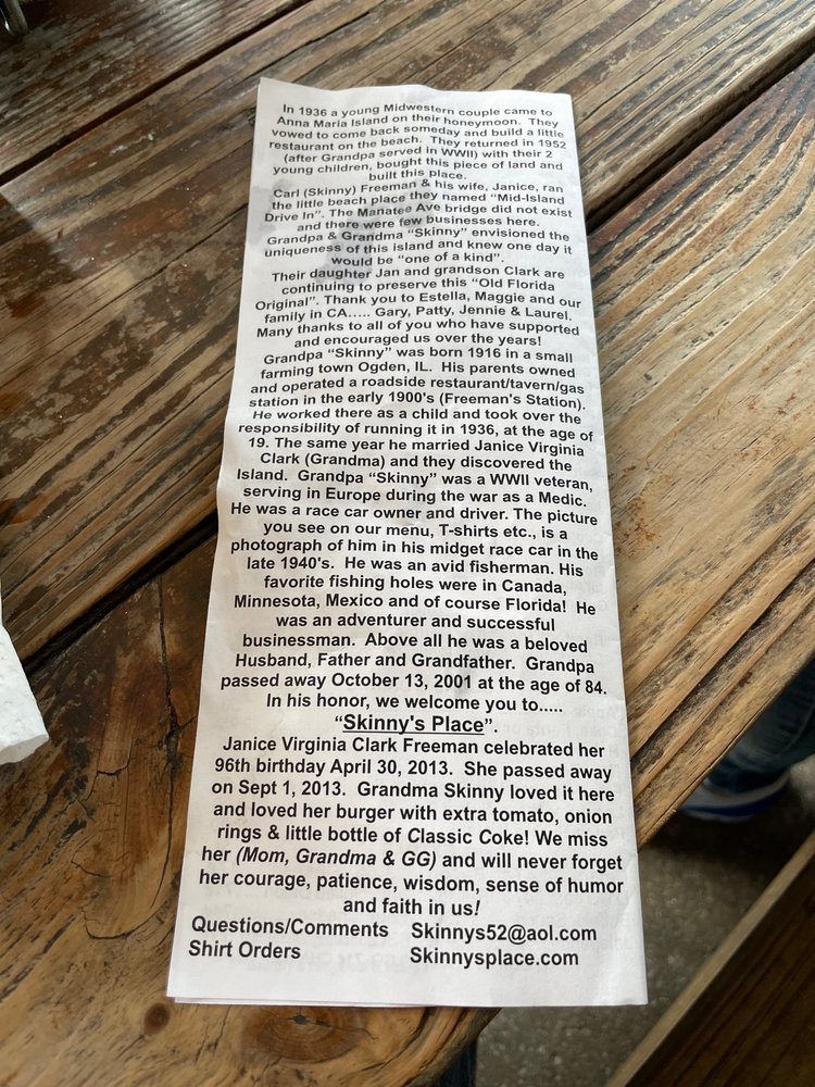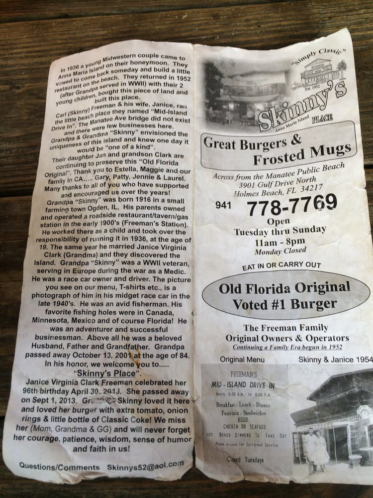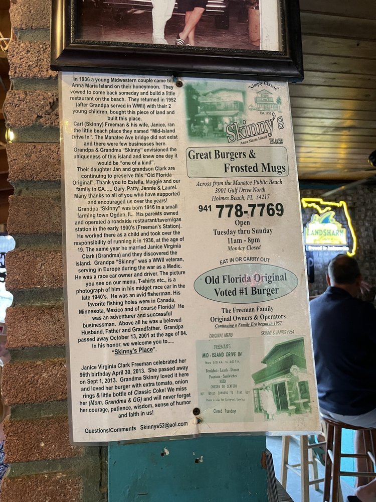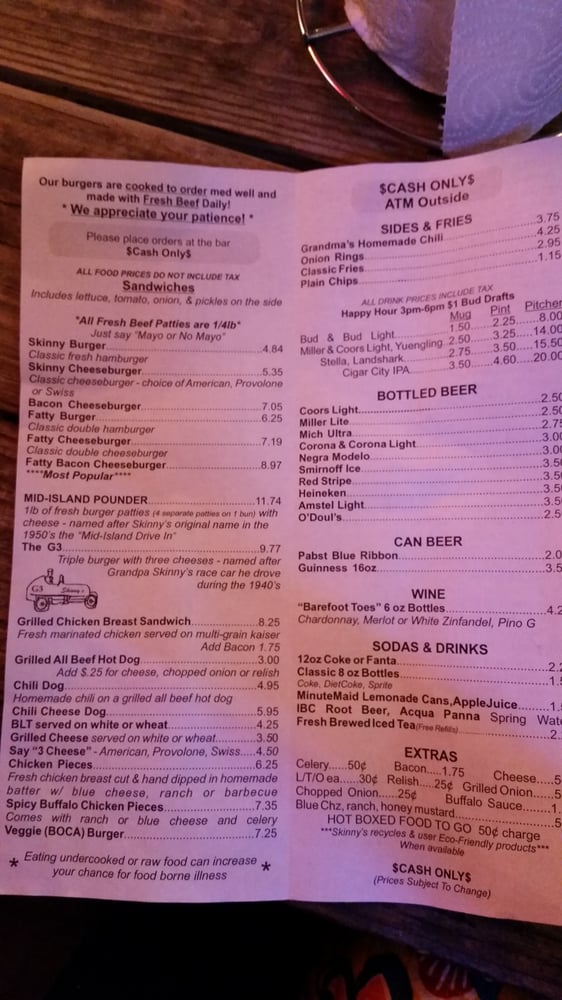 Skinny's Place, located in Holmes Beach, FL, is a casual eatery known for its hot dogs, burgers, and sandwiches. With a diverse menu offering options like the Mid Island Pounder, the G3 triple burger, and the Veggie Burger, there is something for everyone. Sides like Grandma's Homemade Chili and Fatty Fries complement the main dishes perfectly. Customers rave about the laid-back atmosphere, friendly service, and delicious food. The outdoor seating and beach shack vibe add to the charm of this hidden gem. Whether you're looking for a quick beach lunch or a casual dinner spot, Skinny's Place delivers great flavors at affordable prices. Overall, Skinny's Place is a must-visit for those seeking a relaxed dining experience with fantastic food and excellent service.